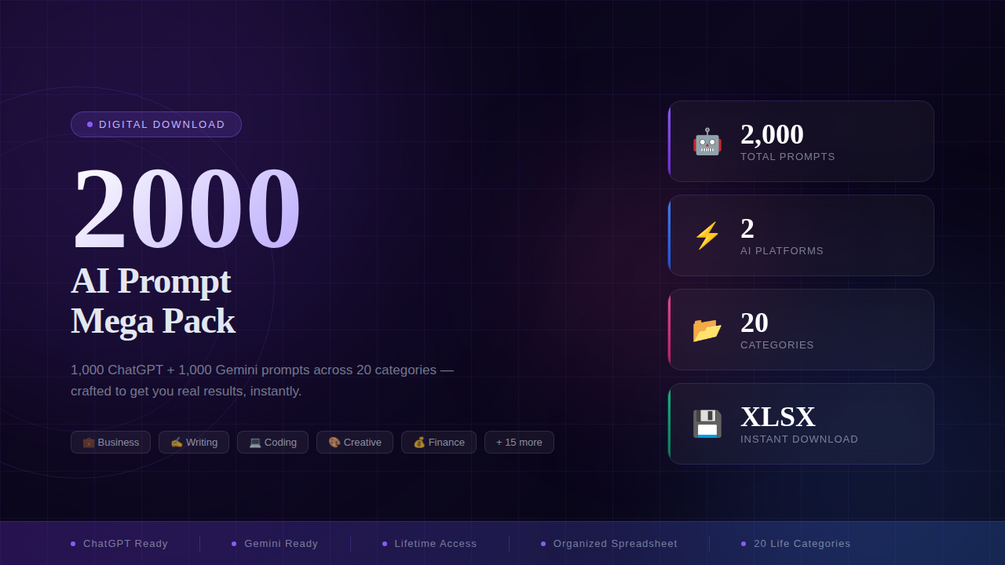 Descrição da ferramenta: Conjunto organizado de 2000 prompts prontos para uso no ChatGPT e Gemini, distribuídos em 20 categorias, facilitando a busca e aplicação em diversas situações profissionais e cotidianas através de uma planilha Excel estruturada.
