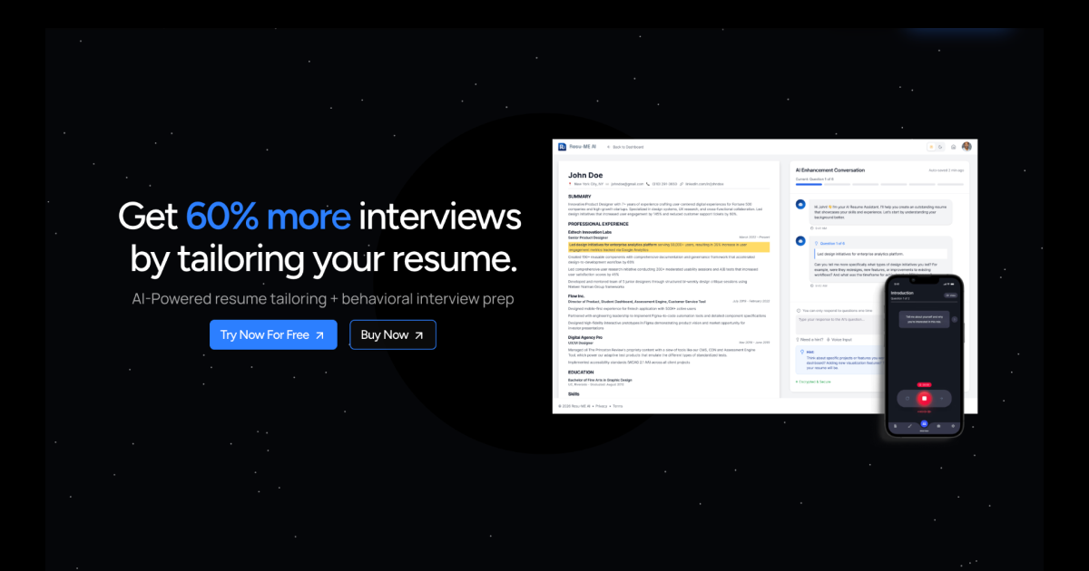 Descrição da ferramenta: Resu-ME AI é uma plataforma que aprimora currículos, realiza entrevistas simuladas com coaching de voz e fornece feedback inteligente para aumentar as chances de sucesso na busca por emprego.