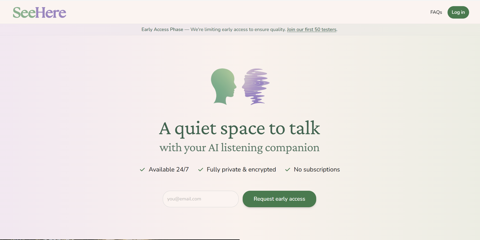 Descrição da ferramenta: SeeHere.ai é um espaço privado e silencioso, projetado por terapeutas, onde o usuário pode refletir e processar pensamentos com uma IA empática, sem rastreamento ou julgamento, promovendo clareza mental em um ambiente seguro.