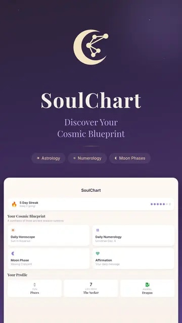 Descrição da ferramenta: SoulChart é um aplicativo que integra Astrologia Ocidental, Numerologia e Zodíaco Chinês, oferecendo perfis cósmicos personalizados baseados na data de nascimento, além de recursos para acompanhar humor, transitos planetários e ciclos numerológicos.