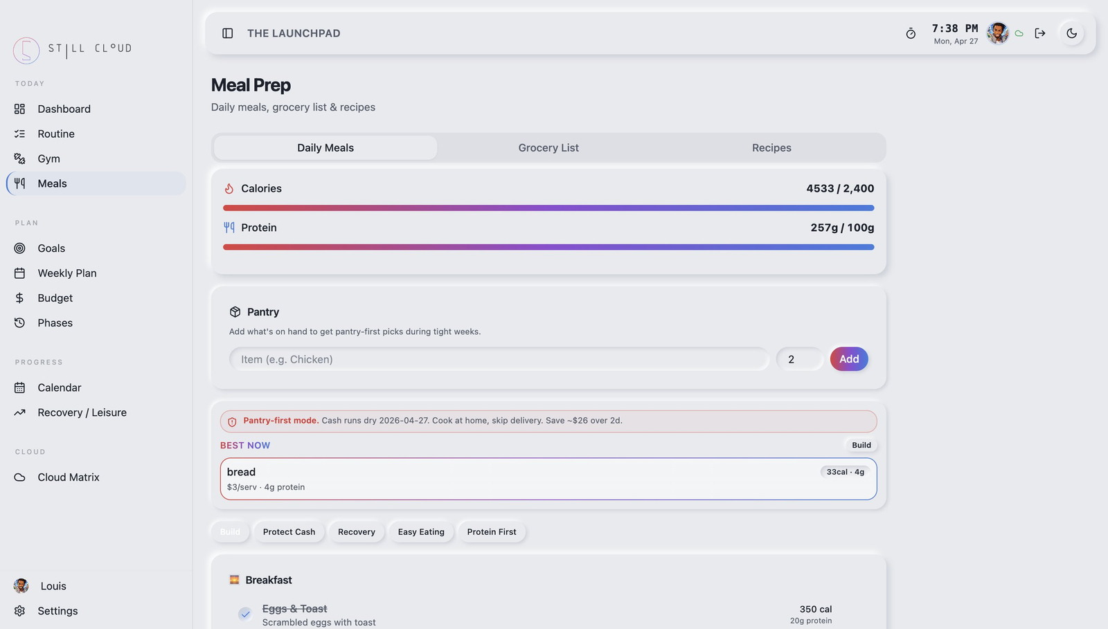 Descrição da ferramenta: Still Cloud é um sistema operacional pessoal que integra rotinas, treinos, refeições, finanças, metas e atualizações diárias em uma plataforma única, permitindo análise de padrões e insights por meio de uma matriz privada na nuvem.