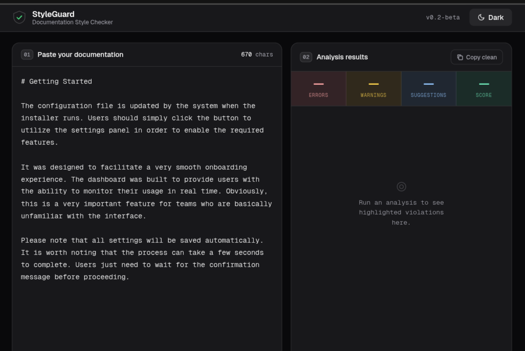Descrição da ferramenta: StyleGuard é uma ferramenta online que verifica documentação em tempo real, identificando voz passiva, verbos fracos, palavras de preenchimento e sentenças longas, com feedback colorido e pontuação de clareza, sem necessidade de login.