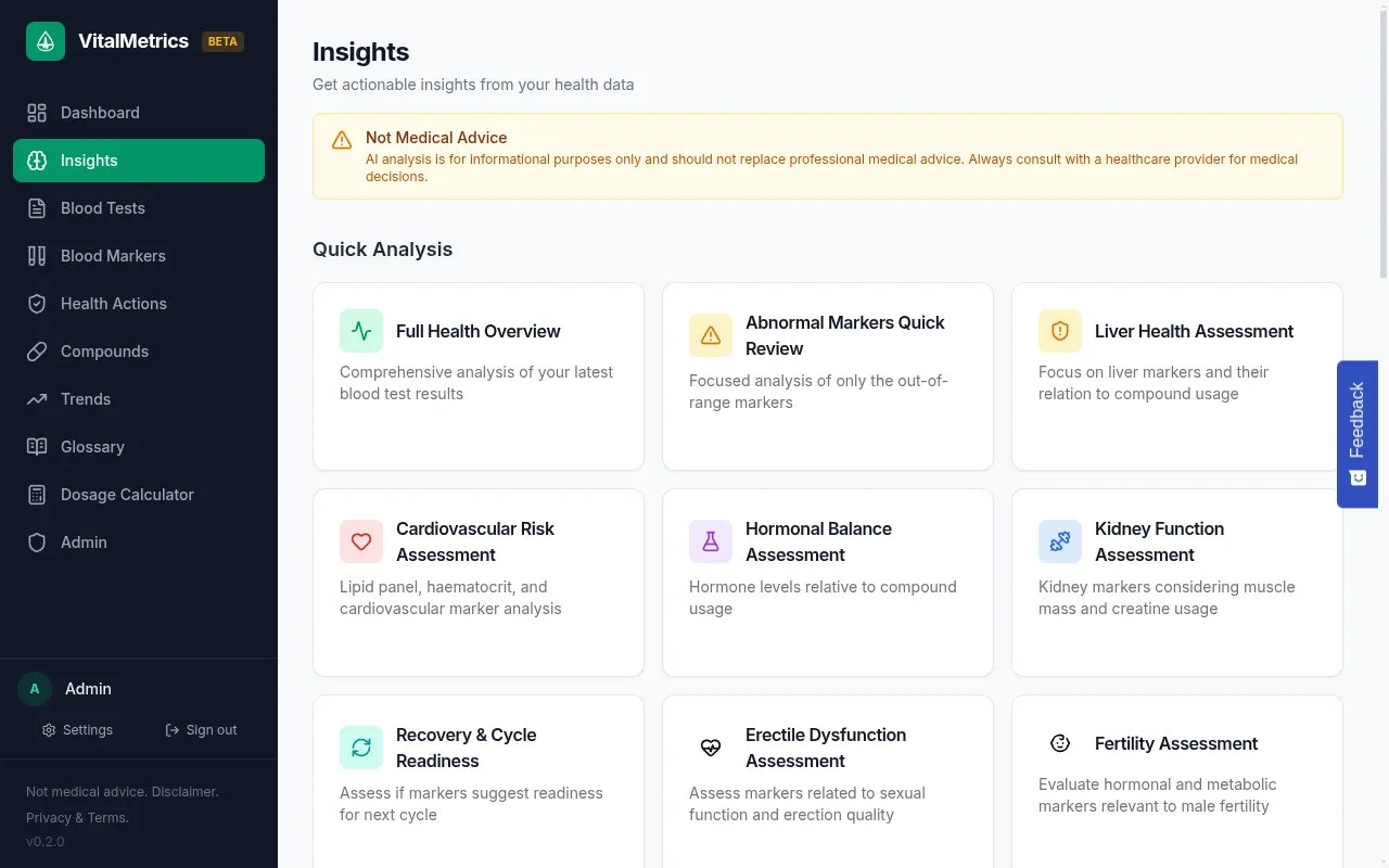 Descrição da ferramenta: VitalMetrics é uma plataforma que permite monitorar marcadores sanguíneos, registrar compostos e obter insights clínicos personalizados, ideal para atletas que levam a saúde a sério. Oferece análise automática de exames e tendências biomarcadoras.