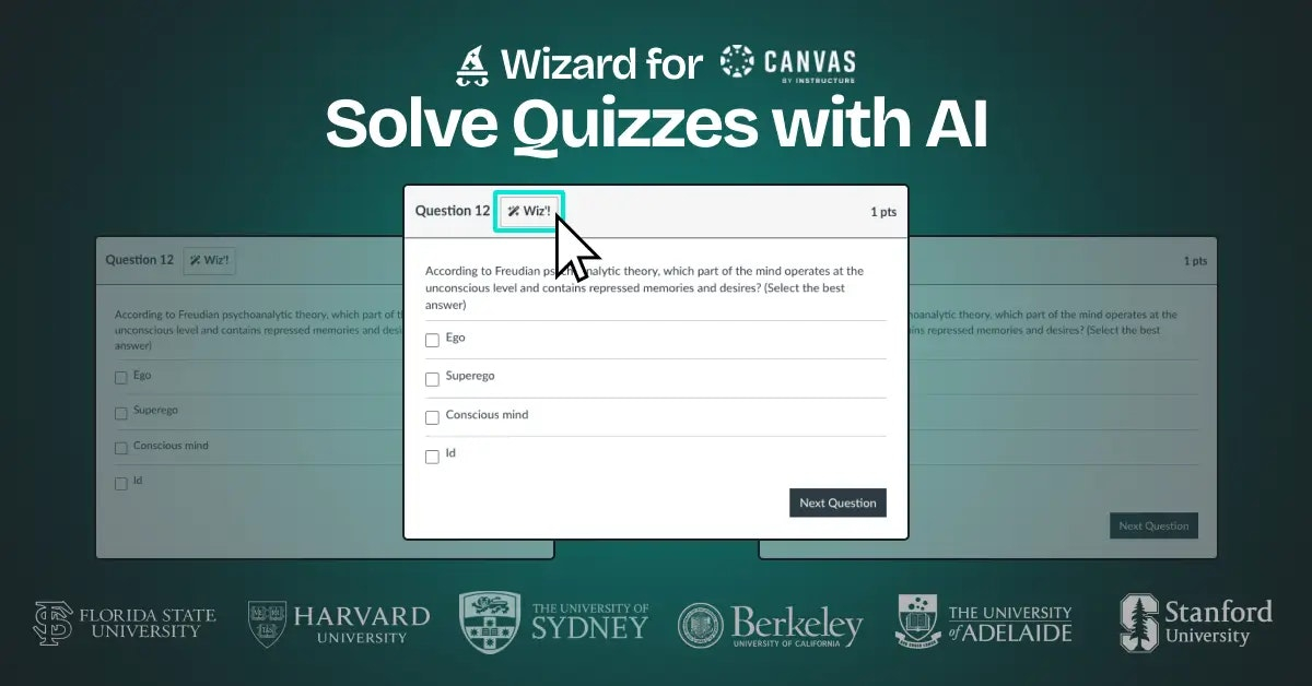 Descrição da ferramenta: Wizard for Canvas é uma extensão de Chrome que utiliza inteligência artificial para fornecer respostas instantâneas a questionários e testes na plataforma Canvas, facilitando o suporte aos estudantes de forma discreta e eficiente.