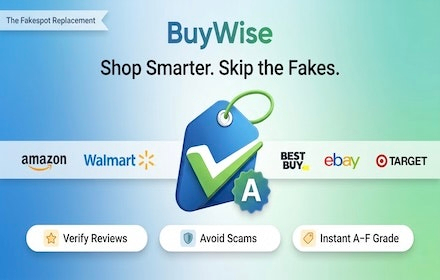Descrição da ferramenta: BuyWise é uma ferramenta gratuita que identifica avaliações falsas em plataformas como Amazon, Walmart, Target, Best Buy e eBay, fornecendo uma classificação de confiança e análises detalhadas para auxiliar na tomada de decisão de compra.