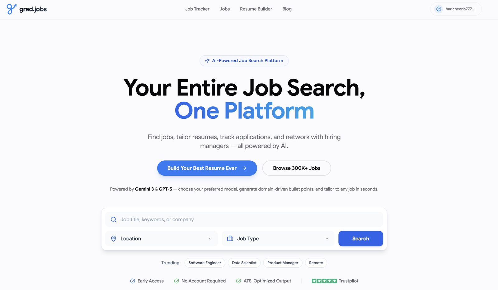 Descrição da ferramenta: A grad.jobs é uma plataforma que oferece acesso a milhares de vagas para graduados, empregos de nível iniciante em tecnologia e posições em engenharia de software, além de ferramentas para criar currículos e portfólios com um clique.