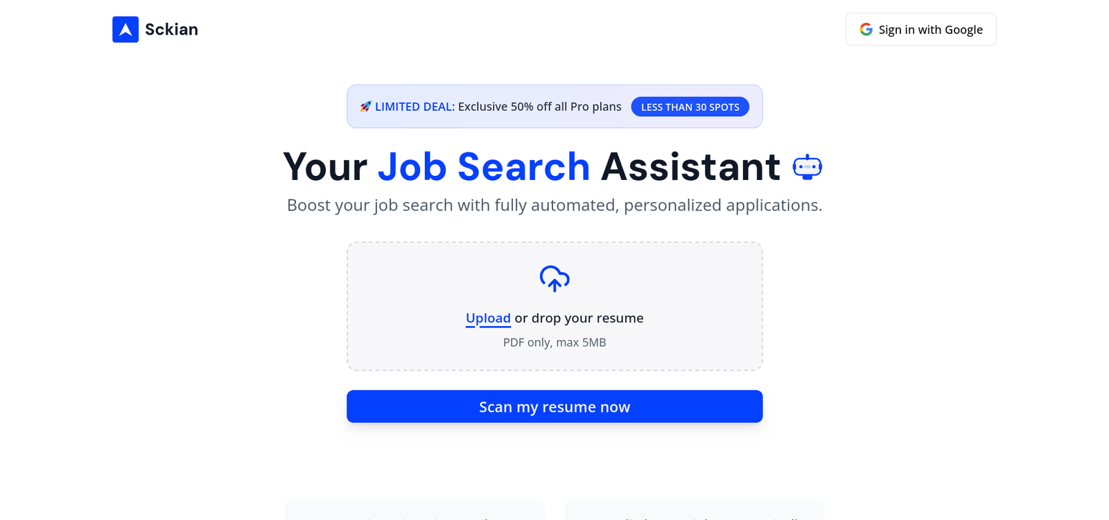 Descrição da ferramenta: Sckian é uma plataforma que automatiza a busca por empregos, identificando vagas relevantes e enviando candidaturas personalizadas 24 horas por dia, aumentando as chances de entrevistas e ofertas em um curto período.
