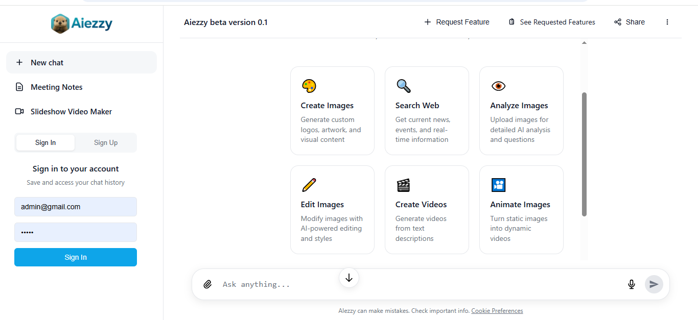 Descrição da ferramenta: Aiezzy é um chatbot de inteligência artificial que realiza buscas, criações, conversões, resumos e automações, integrando múltiplas funções em uma única plataforma personalizável para diversos fluxos de trabalho.