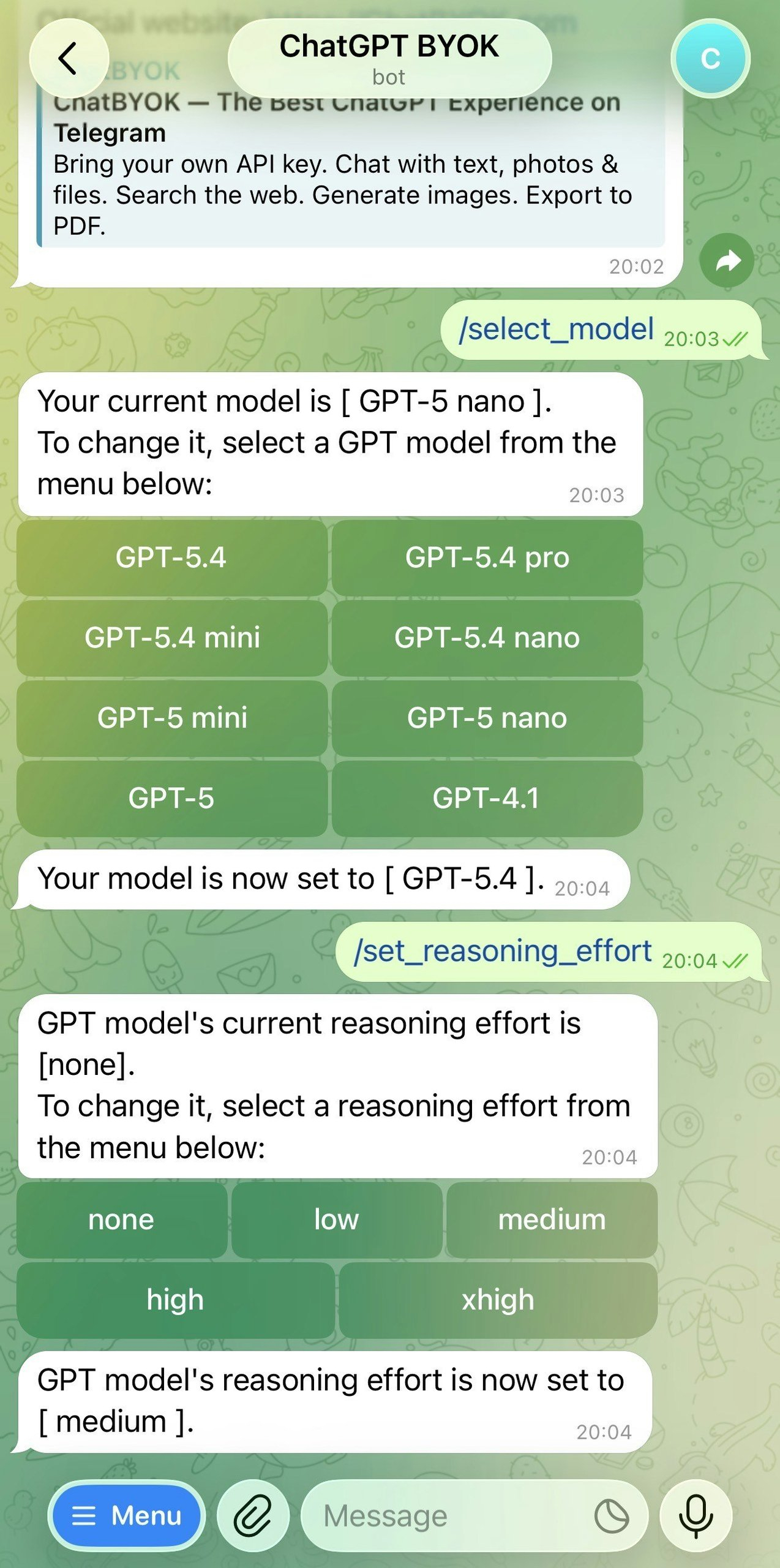 Descrição da ferramenta: ChatBYOK.com é um bot do Telegram que oferece uma experiência avançada com o ChatGPT, permitindo processamento de textos, fotos e arquivos, além de busca na web, edição de imagens e exportação de respostas em PDF com Markdown.