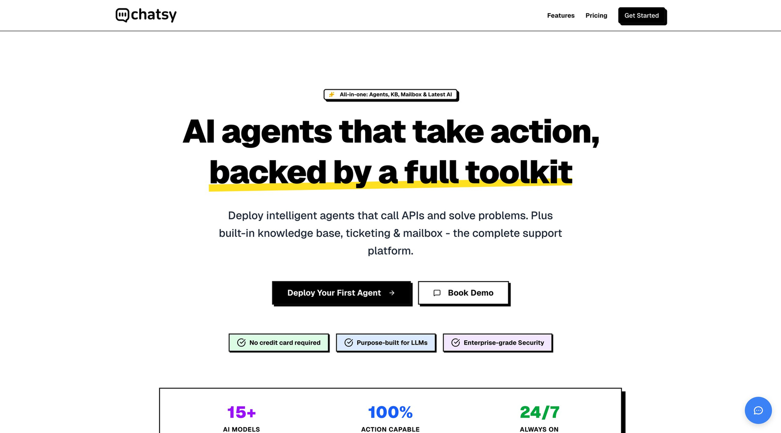 Chatsy é uma plataforma que permite implantar agentes inteligentes capazes de realizar chamadas de APIs, resolver problemas e gerenciar suporte ao cliente com recursos integrados de base de conhecimento, sistema de tickets e caixa postal.