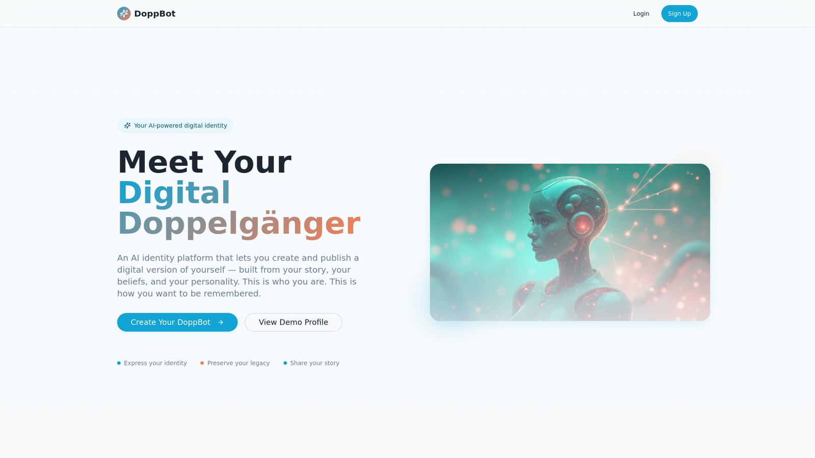 Descrição da ferramenta: DoppBot é uma plataforma de identidade artificial que cria versões digitais interativas personalizadas, treinadas com sua história, valores e personalidade, permitindo compartilhamento, publicação e integração em diferentes ambientes online.