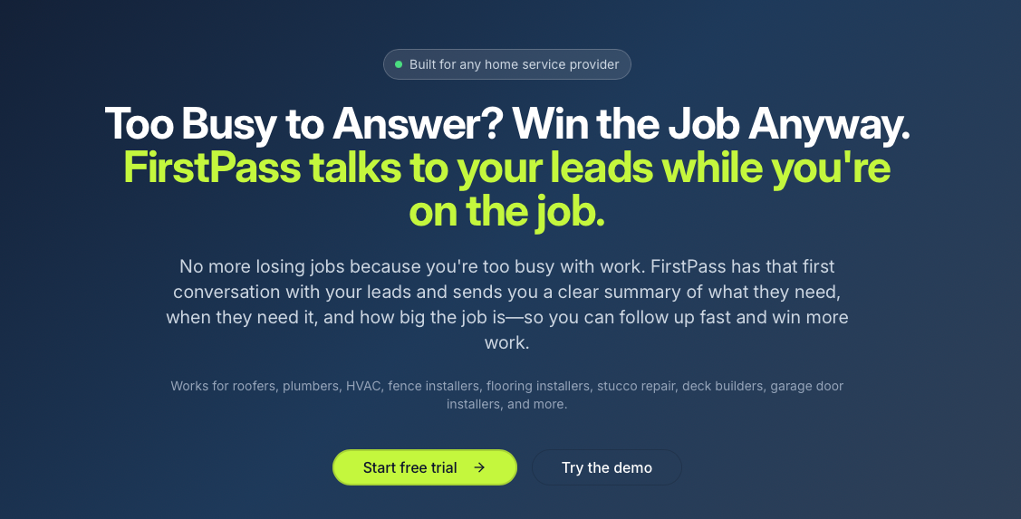 Descrição da ferramenta: FirstPass é uma solução de inteligência artificial conversacional que realiza a triagem inicial de clientes em serviços residenciais, identificando escopo e urgência, permitindo maior controle e eficiência para pequenos provedores de serviços.