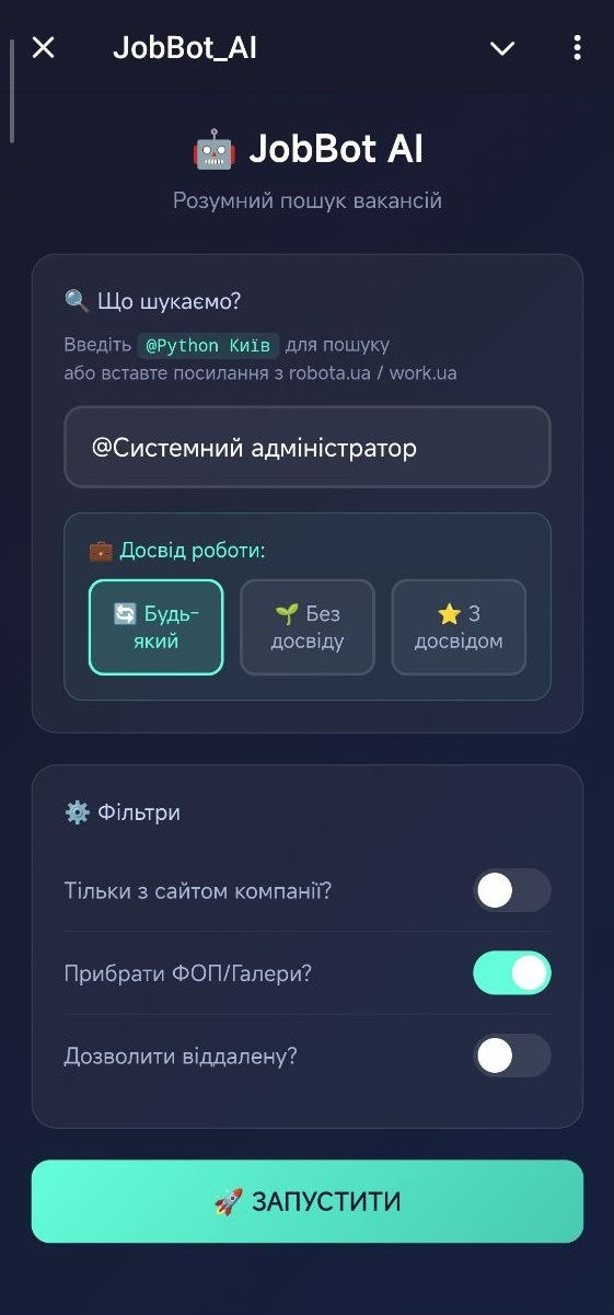 Descrição da ferramenta: JobBot AI é um bot gratuito no Telegram que automatiza a busca por empregos na Ucrânia, analisando plataformas como Work.ua e Robota.ua com inteligência artificial, oferecendo filtros inteligentes e uma interface de navegação semelhante ao Tinder.