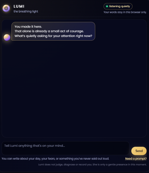 Descrição da ferramenta: LUMI é uma assistente de inteligência artificial silenciosa, que oferece um espaço tranquilo para conversar, refletir e desacelerar, sem necessidade de login ou coleta de dados, promovendo bem-estar e paz de espírito.