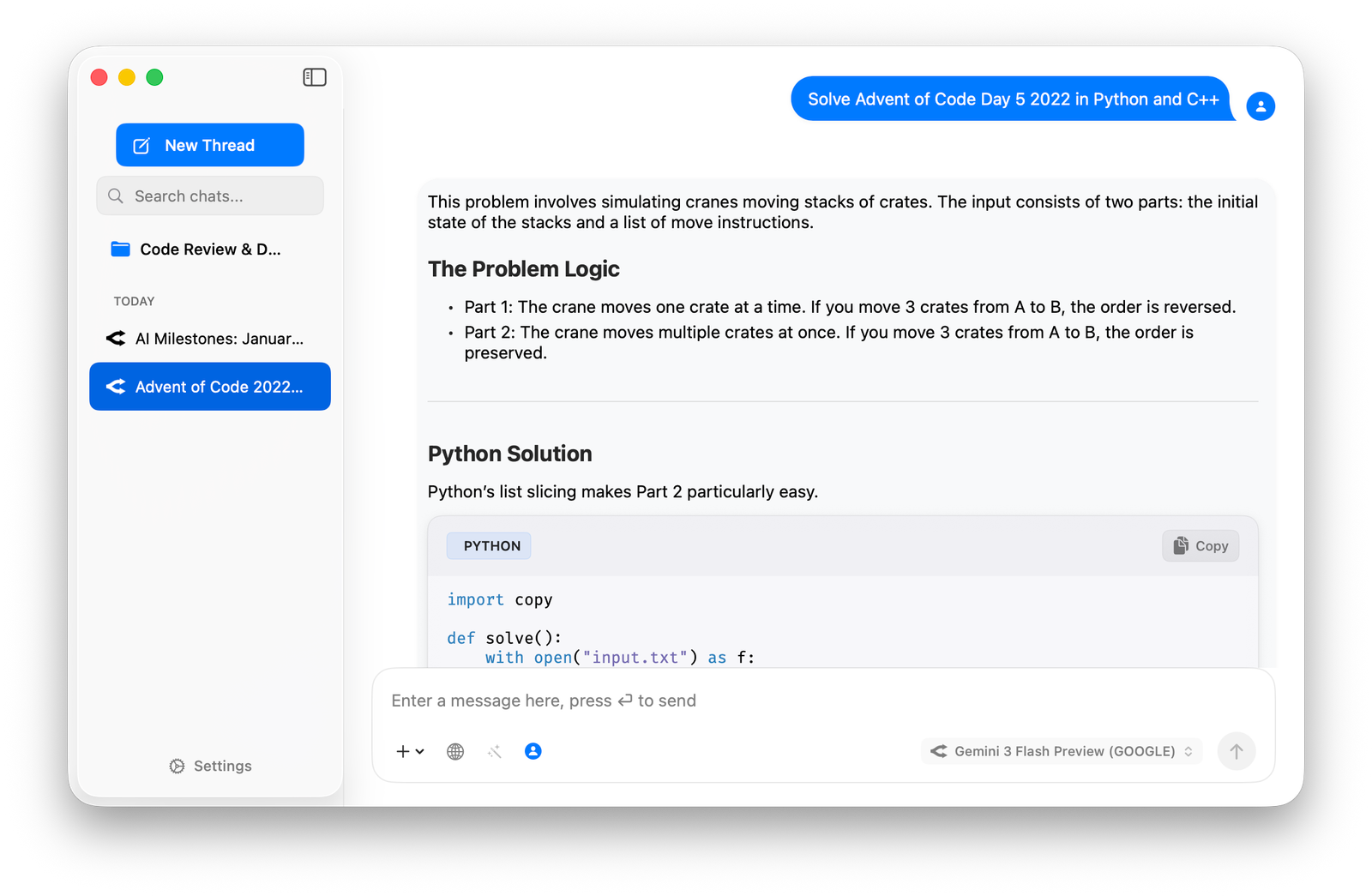 ⚡ Velocidade: Início instantâneo e uso mínimo de RAM (<150MB) para desempenho ágil. 🍏 Eficiência: Otimizado para Apple Silicon, consumindo menos bateria. 🎨 Interface Nativa: Construído inteiramente em SwiftUI, proporcionando uma experiência visual consistente. 🔒 Segurança: Comunicação segura com provedores de IA, sem comprometer a privacidade do usuário. Exemplos de uso: 💬 Chat com IA: Interagir com assistentes virtuais integrados ao sistema MacOS. 📝 Anotações inteligentes: Criar notas ou resumos usando comandos de IA diretamente no aplicativo. 🔍 Análise de textos: Processar documentos ou textos longos para obter insights rápidos. 🤖 Aprimoramento de tarefas diárias: Automatizar respostas ou gerar conteúdo personalizado para o usuário. 🚀 Painel de produtividade: Integrar o uso do AI na rotina diária com alta performance e privacidade garantida.