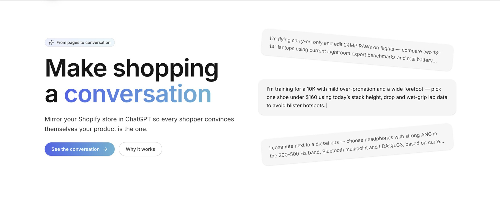Descrição da ferramenta: Zerly converte uma loja Shopify em uma conversa interativa no ChatGPT, permitindo que os clientes façam perguntas, compare opções, visualizem imagens e comprem de forma intuitiva, facilitando a decisão de compra sem navegar por várias páginas.