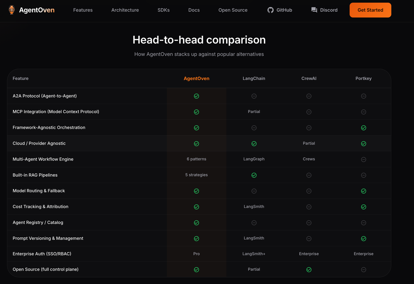 Descrição da ferramenta: AgentOven é uma plataforma de código aberto que fornece controle centralizado para agentes de IA, incluindo registro, roteamento de modelos, orquestração de fluxos de trabalho e suporte nativo ao protocolo A2A.