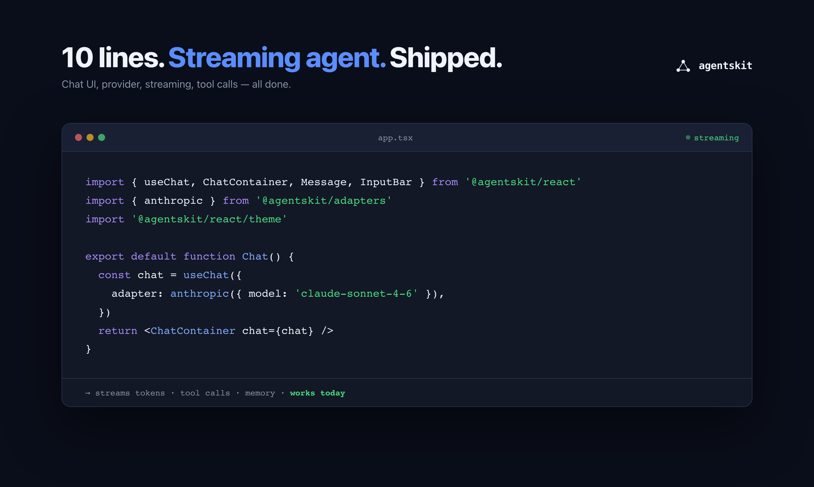 Descrição da ferramenta: AgentsKit é um ecossistema completo para criar agentes de inteligência artificial, oferecendo integração simplificada de bibliotecas, contratos formais e compatibilidade com diversas plataformas, facilitando o desenvolvimento ágil e modular de agentes em JavaScript.
