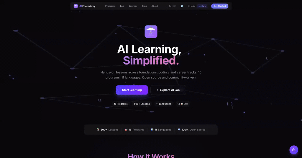 Descrição da ferramenta: AI Educademy é uma plataforma de código aberto que oferece um currículo estruturado em 11 idiomas, com mais de 500 lições interativas, laboratórios de IA e certificações para promover a alfabetização em inteligência artificial acessível a todos.
