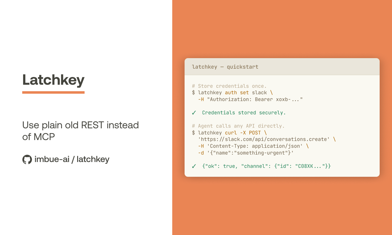 Descrição da ferramenta: Latchkey é uma camada de credenciais para agentes locais de IA, que facilita a autenticação com serviços de terceiros, detectando e injetando credenciais automaticamente em chamadas curl, garantindo segurança e compatibilidade ampla.