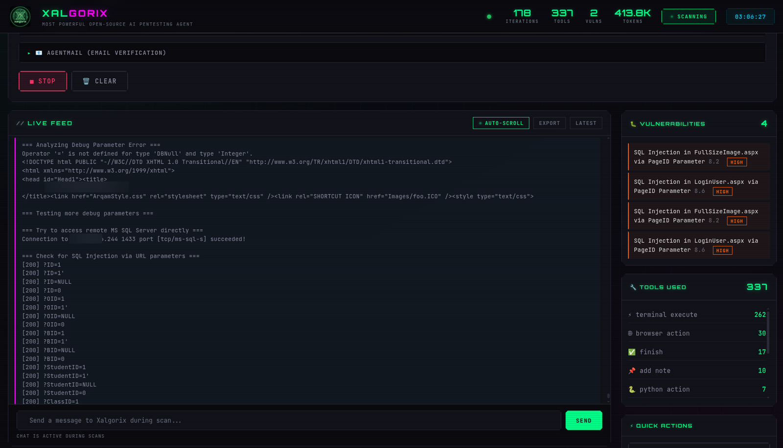 Descrição da ferramenta: Xalgorix é uma plataforma de testes de penetração autônoma, de código aberto, com inteligência artificial integrada, oferecendo mais de 85 ferramentas, interface web, geração de relatórios em PDF e alertas no Discord gratuitamente.