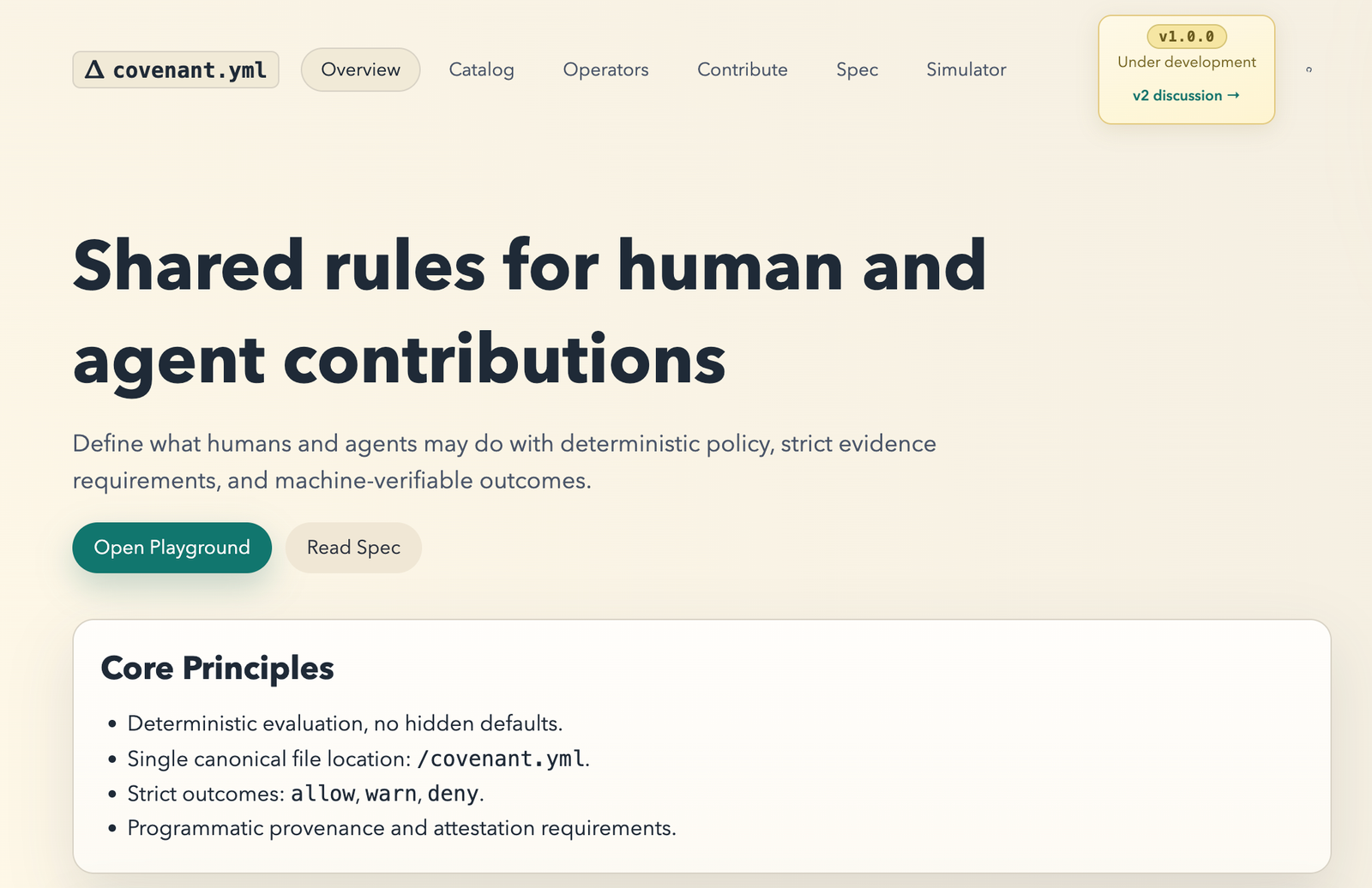 Descrição da ferramenta: covenant.yml é um padrão de política determinística que regula contribuições humanas e de agentes em repositórios, garantindo avaliação transparente, regras claras e rastreabilidade programática das ações.