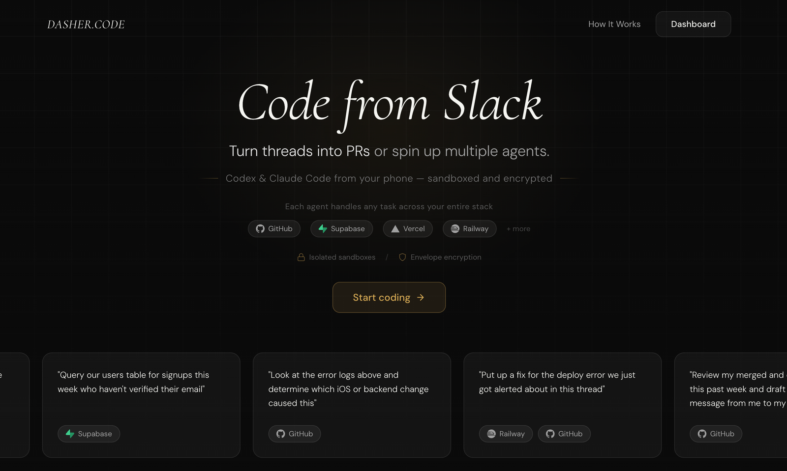 Descrição da ferramenta: Dasher é uma ferramenta que permite codificar via telefone, Slack ou desktop, integrando-se a plataformas como Supabase e Vercel, com foco em segurança e facilidade de uso para desenvolvimento remoto e colaborativo.