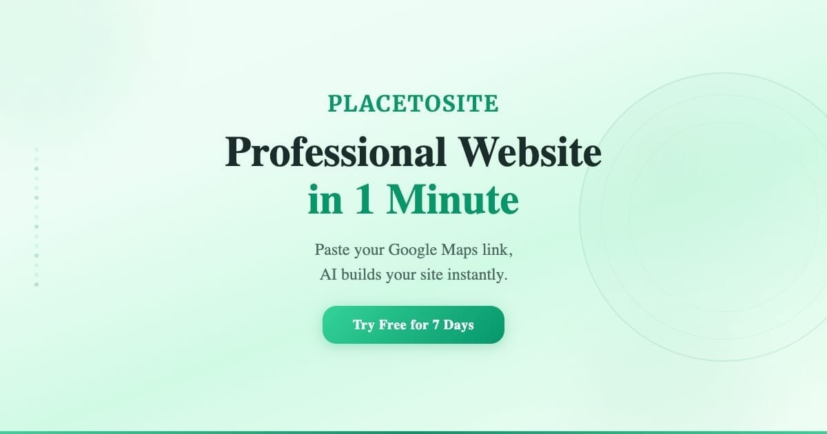 Descrição da ferramenta: PlaceToSite permite criar um site profissional em apenas 60 segundos, bastando inserir o link do Google Maps. A ferramenta oferece uma solução rápida e eficiente para transformar cadastros em sites acessíveis e personalizados.