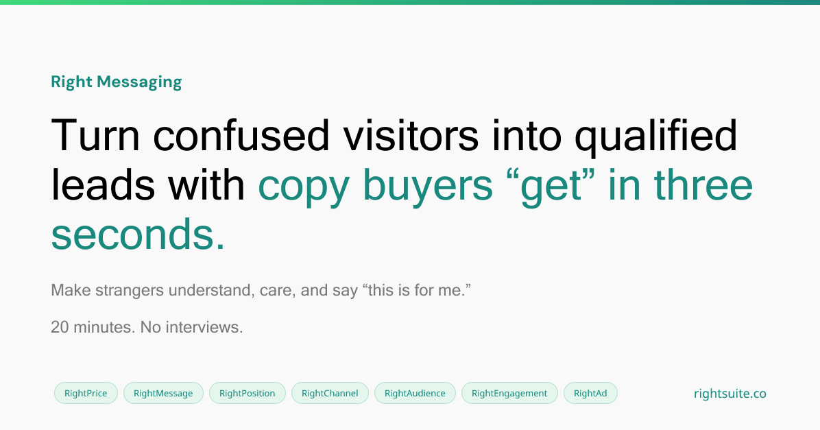 Descrição da ferramenta: Right Messaging é uma ferramenta que simula a reação de compradores ideais às suas mensagens, identificando objeções, pontos de queda e oferecendo sugestões para aprimorar a copy e aumentar a conversão.