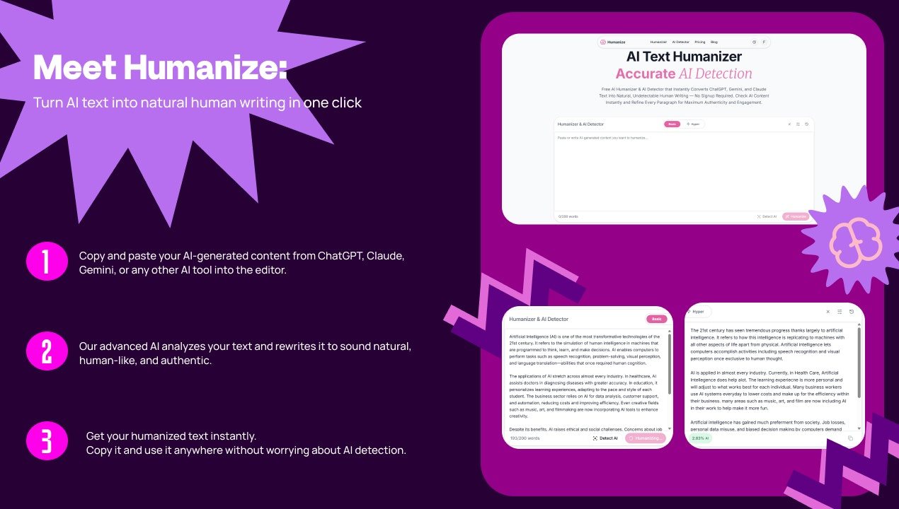 Descrição da ferramenta: Humanize.sh é uma ferramenta gratuita que converte textos gerados por IA em escrita humana natural, tornando-os indistinguíveis de textos produzidos por pessoas, com verificação instantânea e sem necessidade de cadastro.