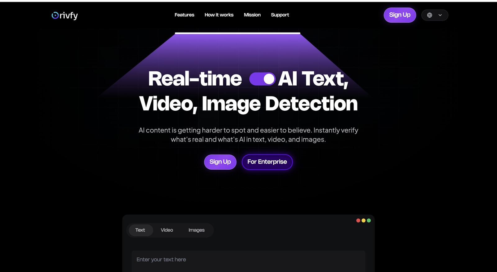 Descrição da ferramenta: Orivfy é uma plataforma que detecta instantaneamente textos, imagens e vídeos gerados por inteligência artificial, auxiliando na verificação de autenticidade de conteúdos digitais para proteger marcas e audiências contra mídias sintéticas.
