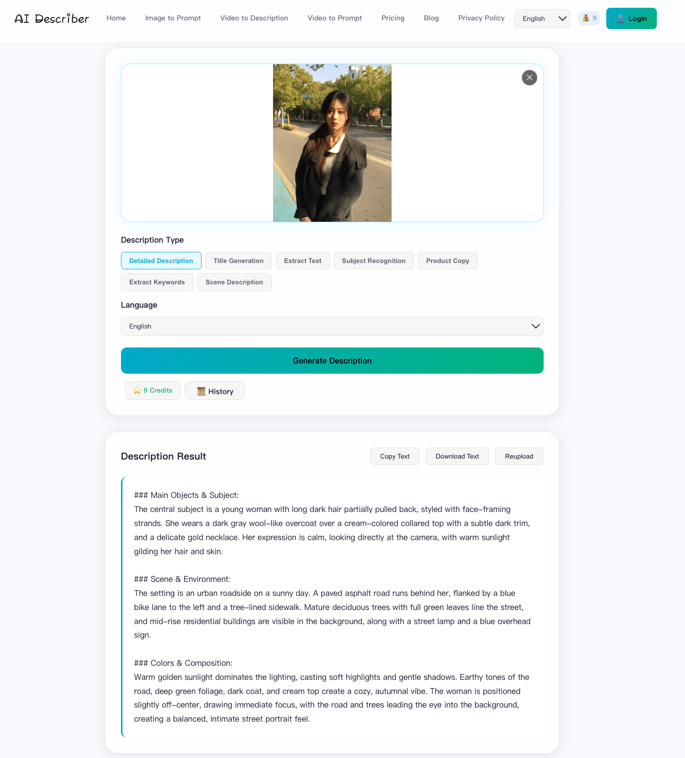 Descrição da ferramenta: aidescr é uma ferramenta de inteligência artificial que converte imagens e vídeos em descrições, prompts, textos alternativos, textos de produtos e legendas para redes sociais, agilizando a criação de conteúdo visual e textual.
