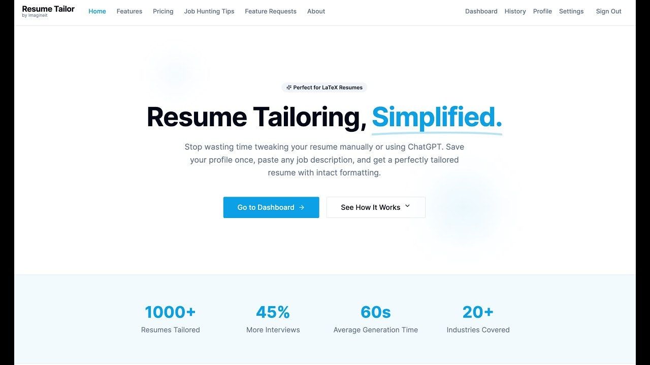 Descrição da ferramenta: Resume Tailor utiliza inteligência artificial para personalizar currículos em LaTeX de acordo com a descrição de vaga, otimizando a compatibilidade e aumentando as chances de sucesso na busca por emprego.