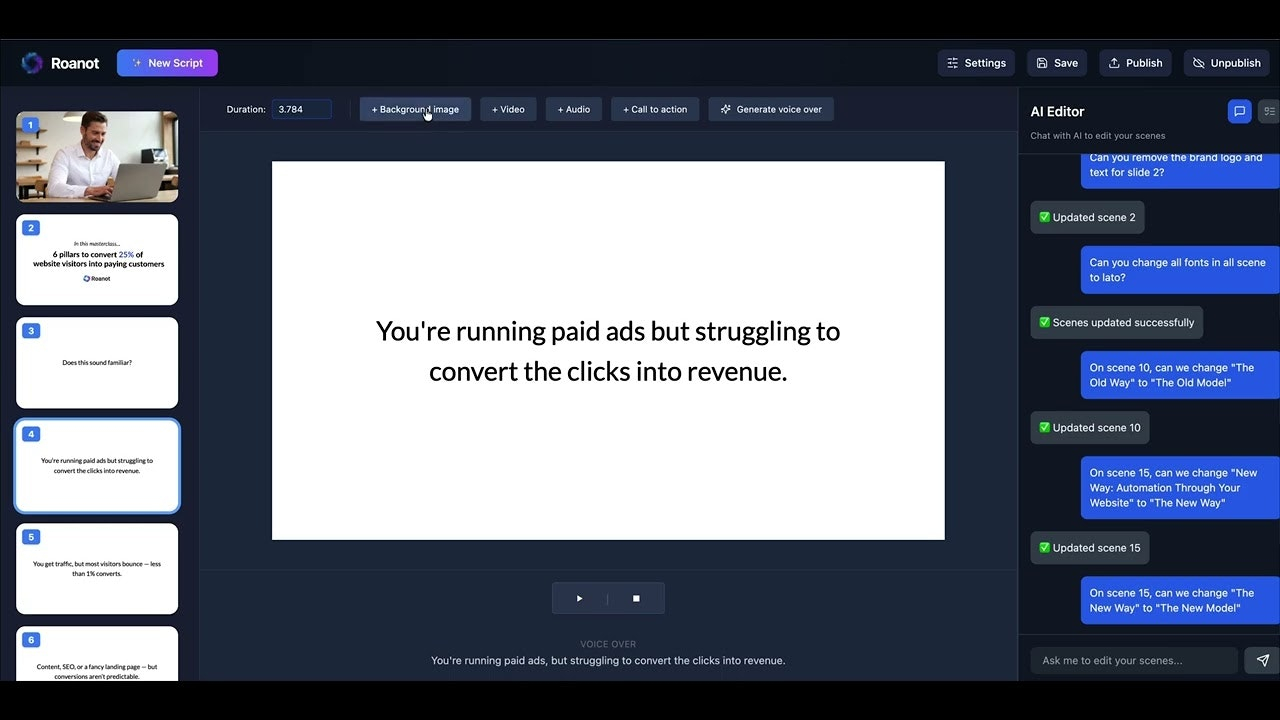 Descrição da ferramenta: Roanot é um editor de vídeo com inteligência artificial que trabalha com cenas editáveis, facilitando a personalização, inclusão de CTAs e integração em experiências web interativas para apresentações de vendas e explicações.