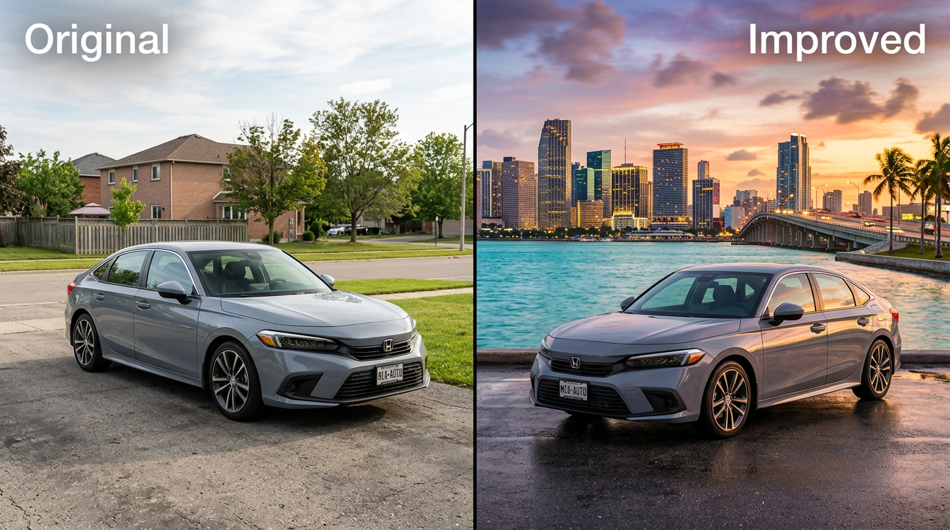 🌅 Troca de fundos: Substitui fundos comuns por cenários ao ar livre mais atraentes para destacar o veículo.