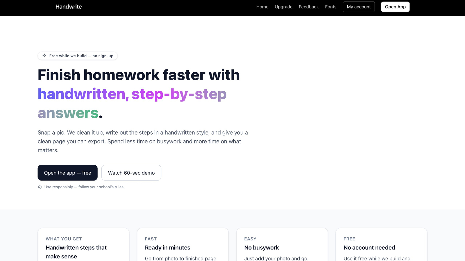 Descrição da ferramenta: Handwrite converte capturas de tela ou fotos de problemas em soluções manuscritas completas, preservando o formato à mão. Permite criar fontes personalizadas e exportar PDFs limpos rapidamente, facilitando a apresentação de respostas com aparência natural e personalizada.