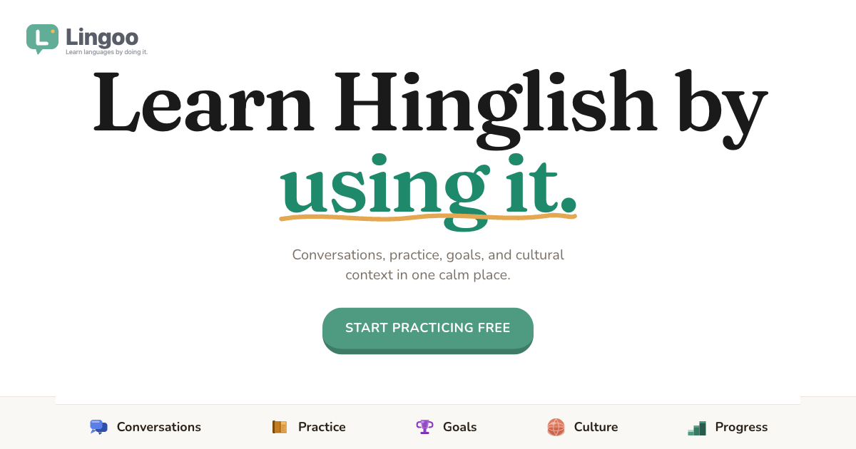 Descrição da ferramenta: Lingoo é uma plataforma que oferece sete modos de prática, conversas com IA baseadas em cenários, chat local no navegador, metas de aprendizagem e acompanhamento de progresso para facilitar o aprendizado do Hinglish, a mistura de Hindi e Inglês usada na comunicação cotidiana.