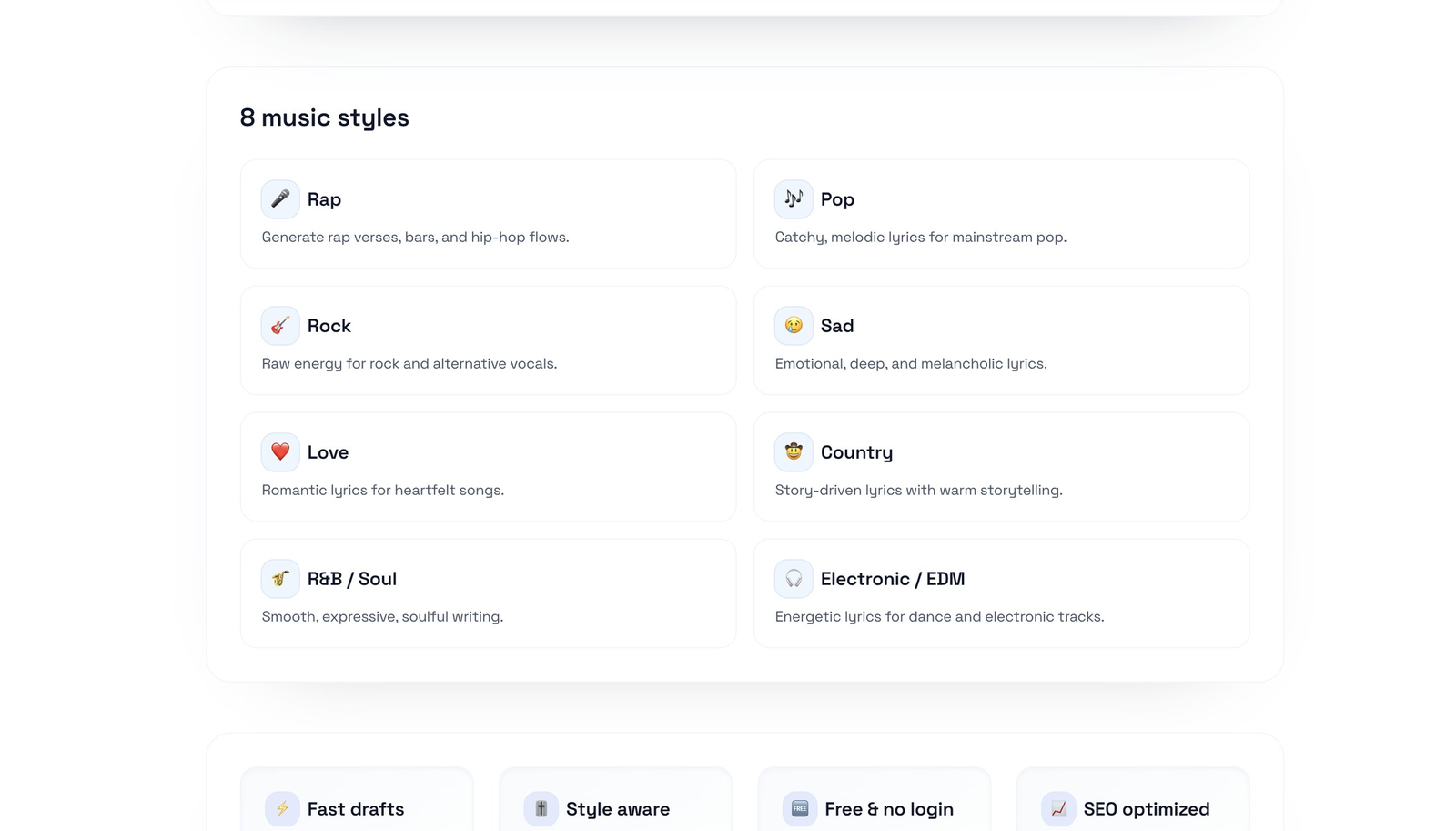 Descrição da ferramenta: Ferramenta de geração rápida e gratuita de letras de músicas, compatível com diversos estilos como rap, pop, rock, sad e love, oferecendo resultados elaborados em poucos segundos sem necessidade de login.