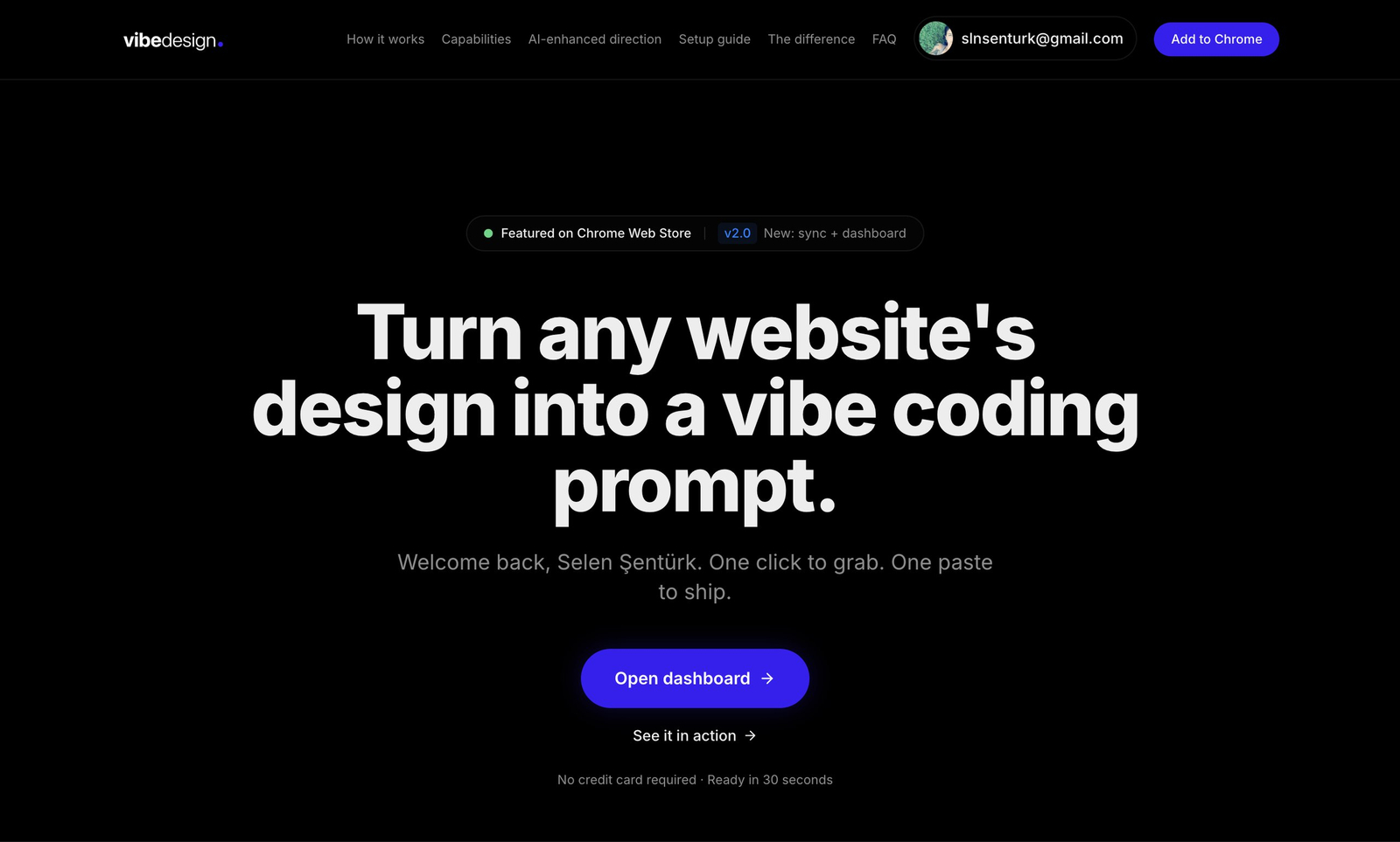 Descrição da ferramenta: VibeDesign é uma extensão para Chrome que extrai tokens de design de sites ao vivo, convertendo-os em prompts estruturados para ferramentas de IA, facilitando a codificação e o desenvolvimento visual.