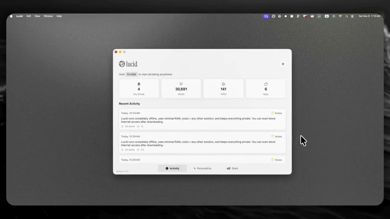 Descrição da ferramenta: Lucid Voice é uma ferramenta de ditado de voz offline para Mac que permite escrever até três vezes mais rápido, utilizando reconhecimento de fala natural, sem necessidade de conexão com a internet ou assinaturas, garantindo privacidade total.