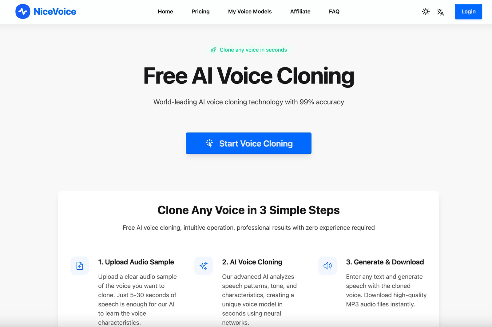 Descrição da ferramenta: NiceVoice é uma plataforma de clonagem de voz baseada em inteligência artificial que permite criar fala natural a partir de textos, utilizando sua própria voz, de forma rápida, segura e gratuita.