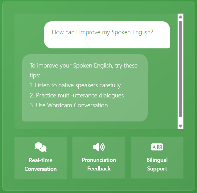 Wordcam Conversation é uma plataforma que permite aos usuários praticar conversação em inglês por meio de perguntas por voz, recebendo respostas bilíngues em inglês e chinês para aprimorar pronúncia e fluência.