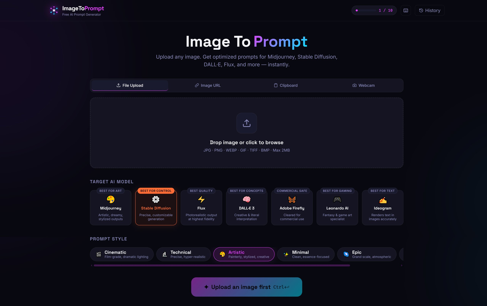 O ImageToPrompt é uma ferramenta que analisa imagens e gera automaticamente prompts precisos para IA, suportando sete modelos diferentes, incluindo prompts negativos, com resultados rápidos e sem necessidade de login ou pagamento.