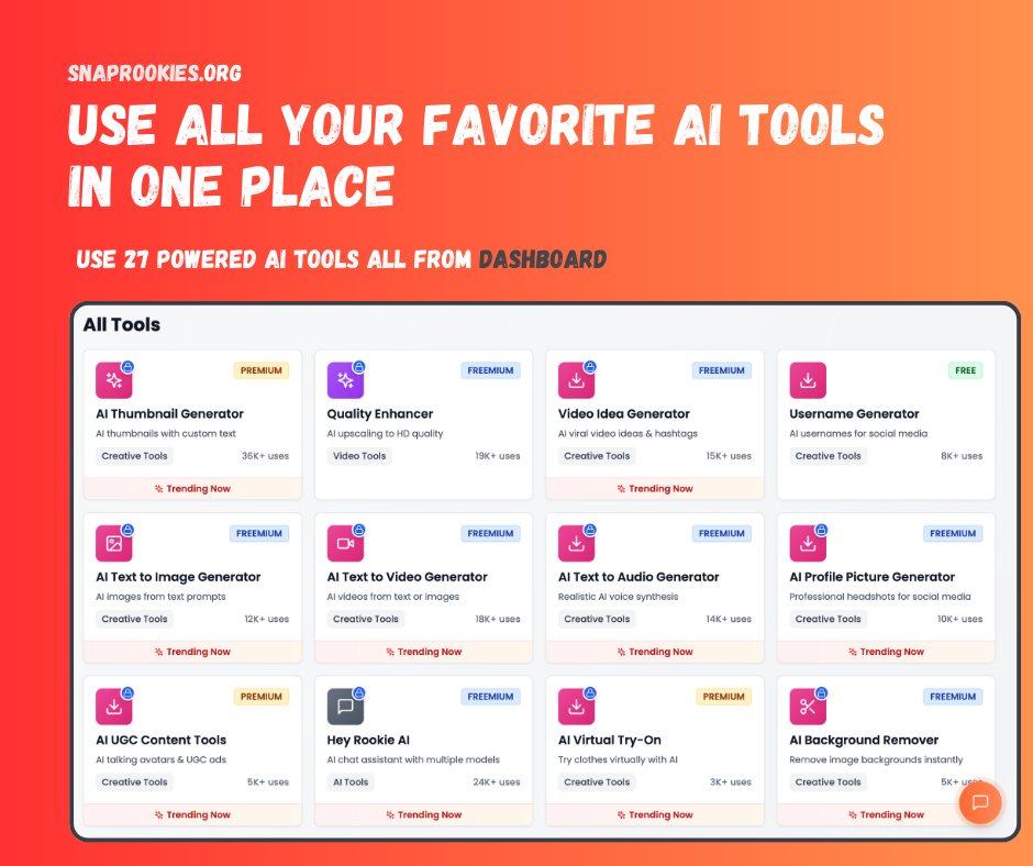 Descrição da ferramenta: Snap Rookies é uma plataforma integrada de inteligência artificial que oferece mais de 27 ferramentas para criação de conteúdo, edição de imagens, vídeos, áudios e suporte a tarefas diárias em negócios e serviços.