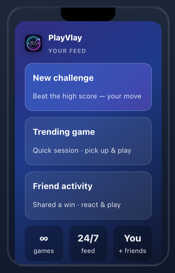 Descrição da ferramenta: PlayVlay é uma plataforma de feed social de jogos, permitindo sessões rápidas com mini-games, desafios em tempo real e criação de jogos usando ferramentas assistidas por IA. Ideal para entretenimento instantâneo e interação social.