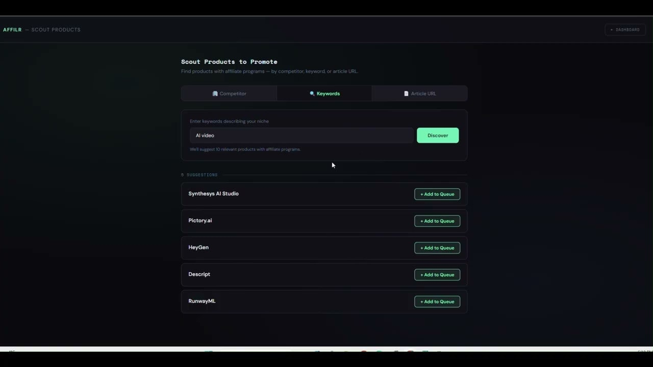 Descrição da ferramenta: Affilr é uma plataforma que automatiza a busca por programas de afiliados, permitindo que marketers e blogueiros encontrem links de cadastro para diversos produtos e nichos de forma rápida e eficiente.