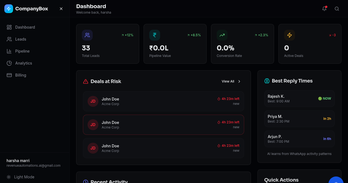 Descrição da ferramenta: CompanyBox Enterprise é uma solução de inteligência artificial que monitora o WhatsApp de agentes imobiliários, detectando leads inativos e fornecendo respostas automáticas para recuperar negócios perdidos, integrando-se ao CRM existente em poucos minutos.