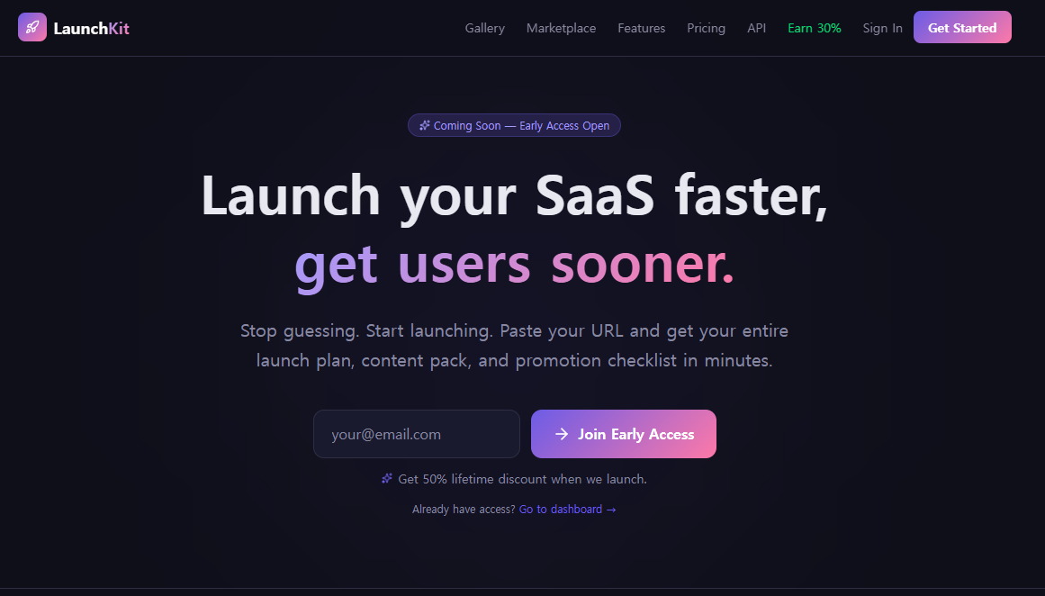 Descrição da ferramenta: LaunchKit é uma plataforma integrada que permite criar páginas de lançamento, coletar e-mails, seguir checklists e promover produtos SaaS rapidamente, otimizando o processo de lançamento e validação de ideias para desenvolvedores independentes.