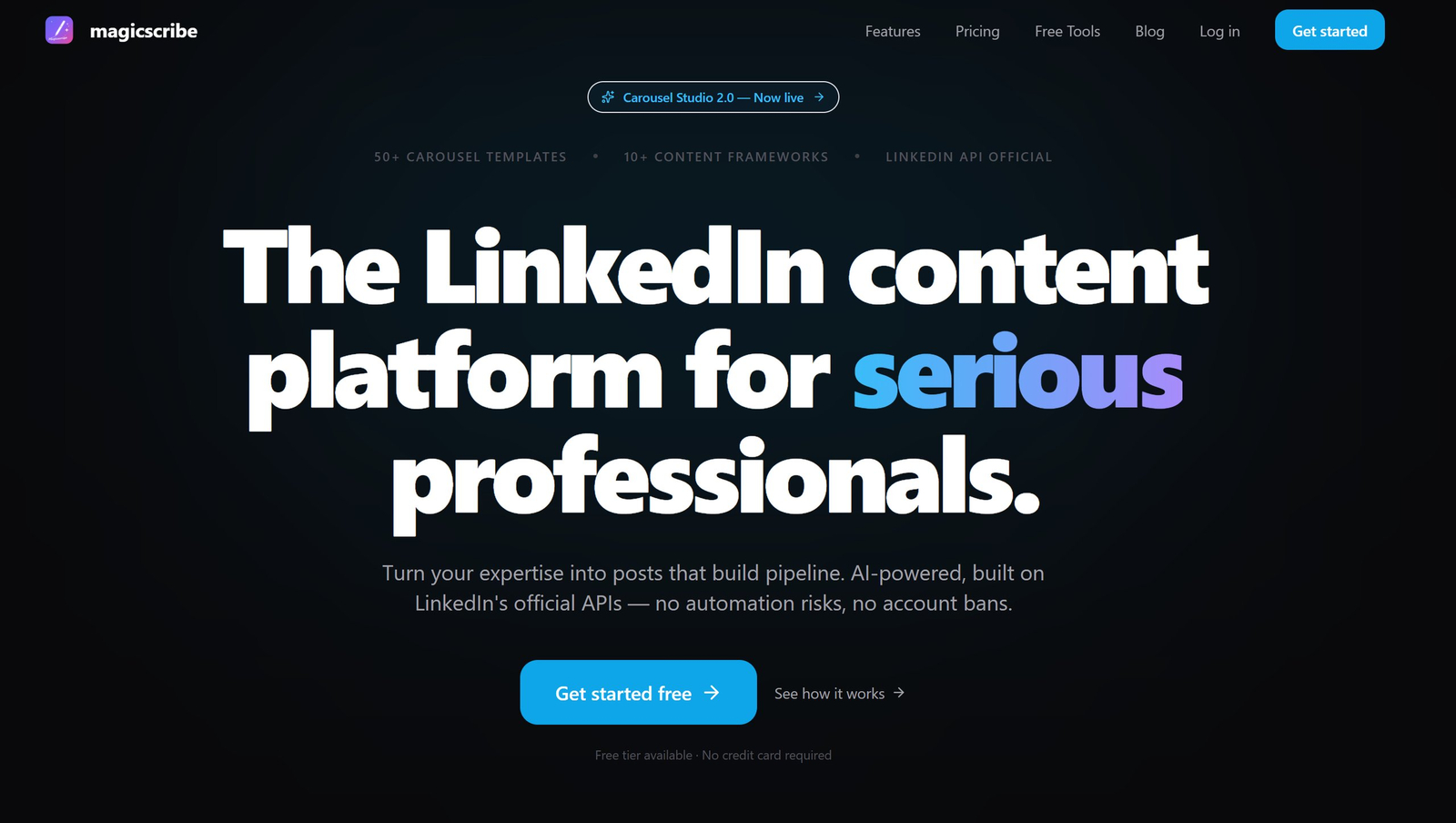 Descrição da ferramenta: MagicScribe é uma plataforma de criação de conteúdo para LinkedIn, que utiliza inteligência artificial para gerar, editar e agendar posts profissionais de forma rápida e segura, integrando diversas funcionalidades em um único painel.