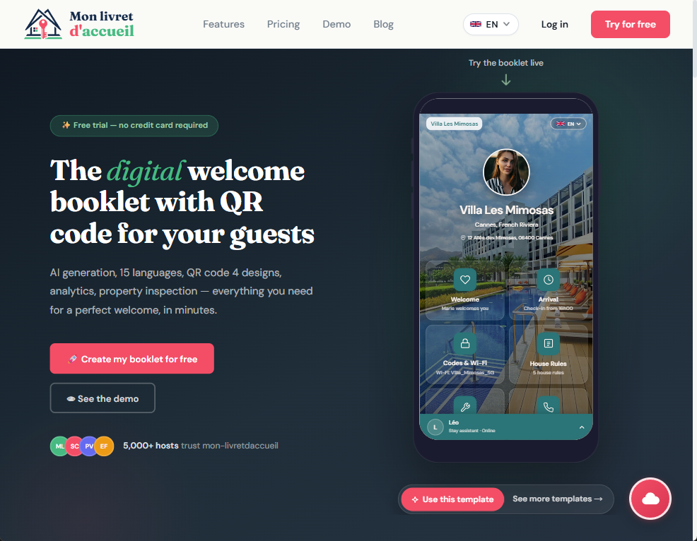 Descrição da ferramenta: Mon Livret d’Accueil é uma plataforma que gera digitalmente guias de boas-vindas personalizados para anfitriões de aluguel por temporada, incluindo recomendações locais, informações essenciais e suporte via chatbot, tudo em poucos minutos.